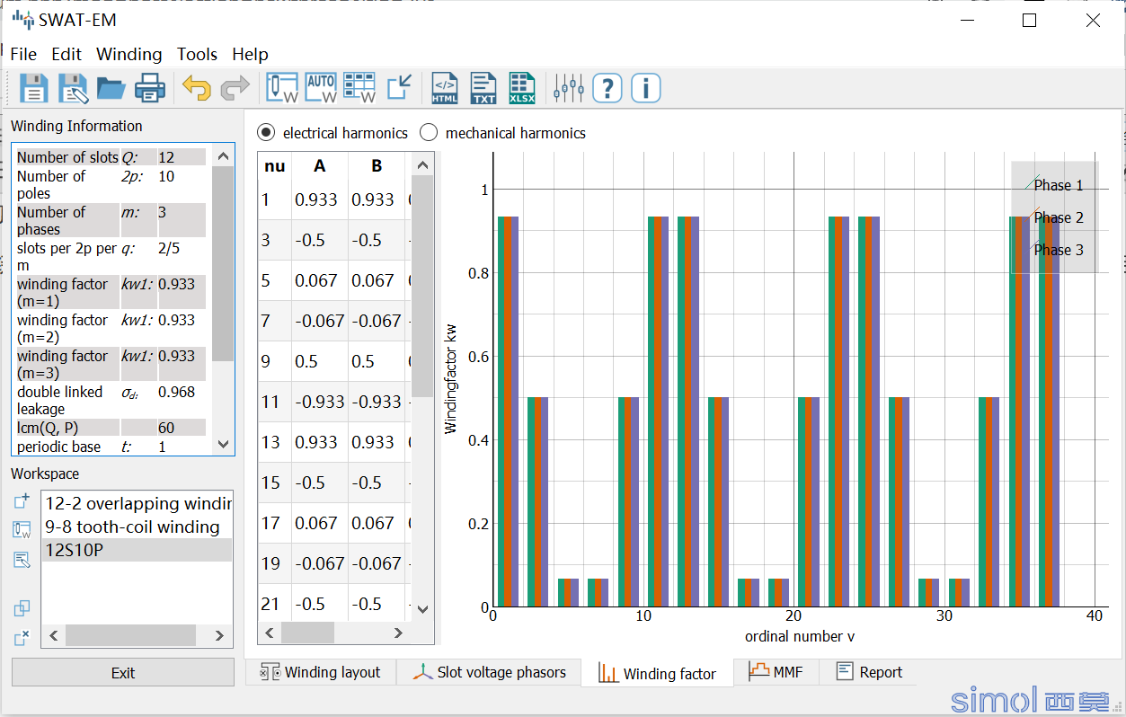 The software can be used to design any multi-phase single-layer or double-layer windings. It supports both concentrated windings and distributed windings. It can analyze winding arrangement, MMF waveform, star diagram, winding coefficients, etc., and can generate reports. Winding Design Software SWAT-EM.